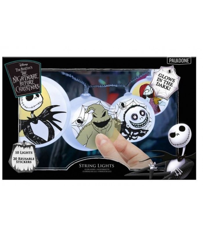 Paladone presenta esta lámpara de pesadilla antes de navidad. tamaño: 130 cm de cuerda con 10 luces y 20 pegatinas reutilizables y brillan en la oscuridad. requiere de 2 baterías aa (no incluidas).