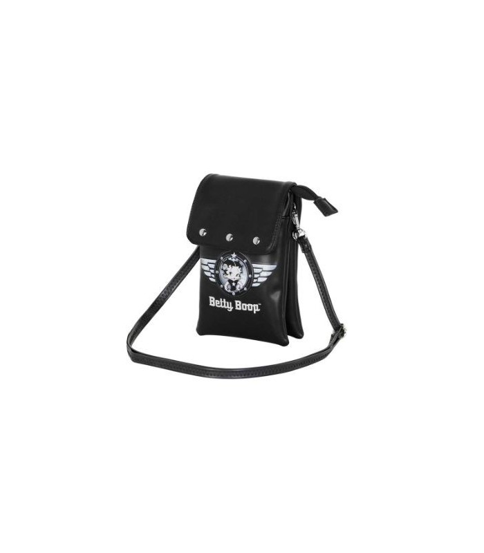 Bolso para Móvil Betty Boop Motor Love. Betty Boop. Bolso pequeño para llevar tu móvil con dos compartimentos con cremallera superior. Cierre magnetico con solapa y bolsillo frontal abierto. Forro interior. Bandolera ajustable y extraíble de 100cm. Bolsillo de seguridad en la parte trasera.
