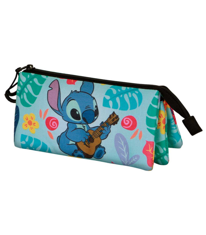 Estuche Portatodo Triple Lilo y Stitch Guitar. Lilo y Stitch. Estuche portatodo con tres compartimentos para tus pertenencias, fabricado en material de alta resistencia (Ripstop). Cuerpo repelente a los liquidos que soporta manchas leves. Los dos bolsillos exteriores se abren mediante una cremallera principal yel tercer bolsillo se abre con otra cremallera independiente en el interior.