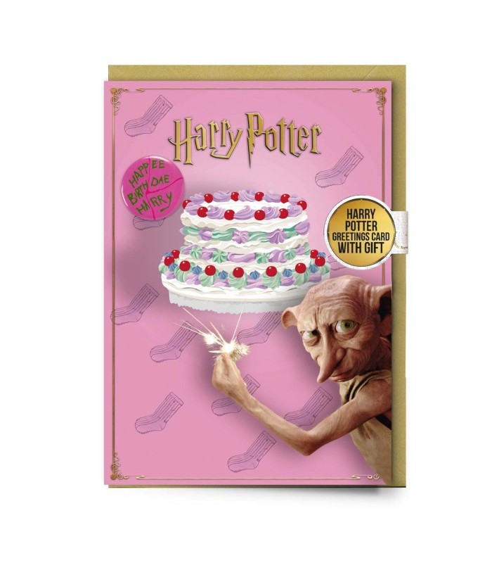Harry Potter Dobby Happy Birthday Cake Greetings card with Button Badge