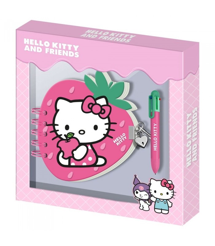 Pack de diario con encuadernación en espiral y bolígrafo de 6 colores. Diario con tapas rígidas en forma de fresa, diseño decorativo impreso, 80 hojas interiores blancas con un motivo ligero de un personaje y candado (incluye dos llaves). Bolígrafo con seiscolores de tinta: violeta, verde, naranja, rojo, azul y negro; con un mecanismo retráctil que permite una selección rápida y práctica del color. Ambos artículos se presentan juntos en una caja de regalo decorativa.