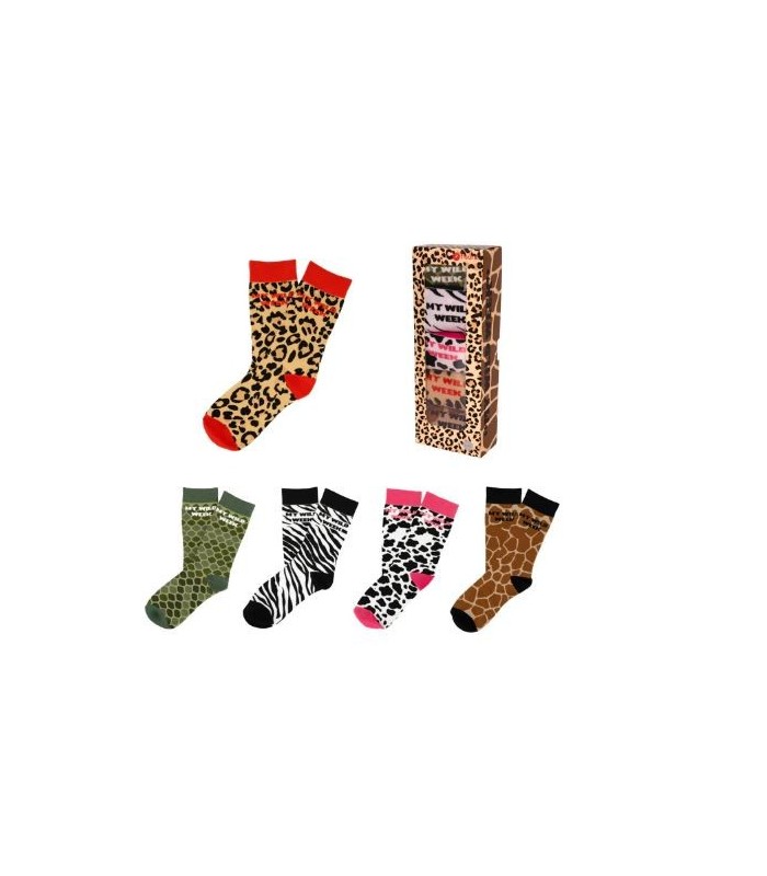 El pack contiene 5 calcetines diferentes: Vaca, cebra, leopardo, jirafa y serpiente