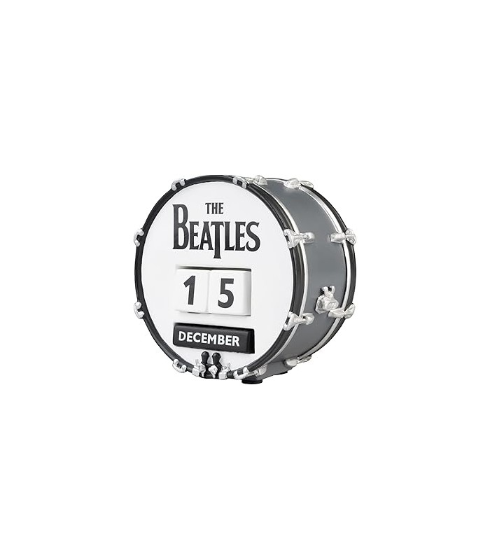 Este calendario perpetuo de The Beatles está inspirado en el bombo de la batería que aparece en la portada de Sgt. Peppers Lonely Hearts Club Band. Tiene un diseño en 3D que muestra en un lado el logotipo clásico de la banda y en el otro el mítico diseño psicodélico de Sgt. Peppers.