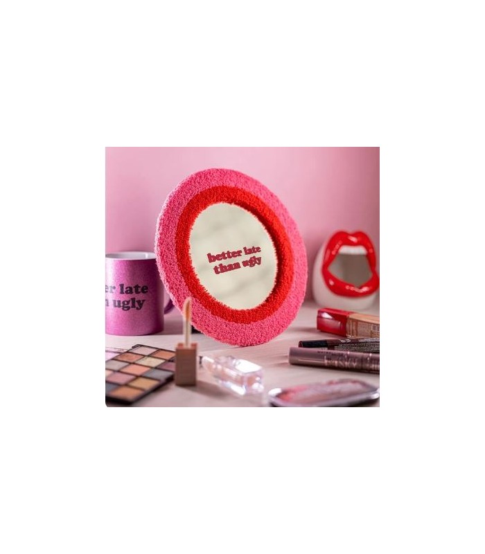 Si prefieres llegar tarde, pero lucir increíble el espejo de borreguito rosay rojocon el mensaje better late than ugly" es para ti. Con este espejo original, dejarás claro que la puntualidad puede esperar cuando se trata de ir de punta en blanco"