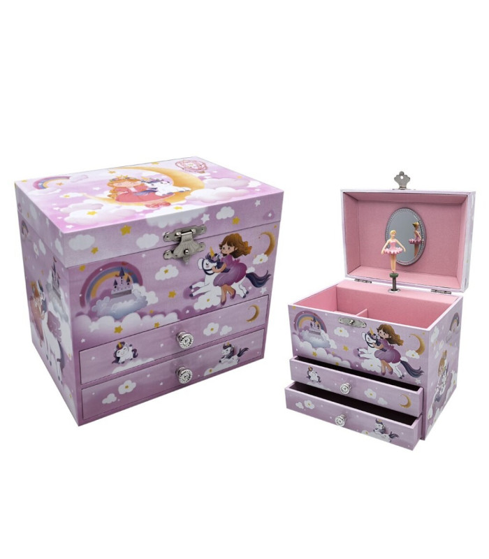JOYERO MUSICAL BAILARINA CON 2 CAJONES. HECHO EN PVC Y FORRADO EN PAPEL. CUANDO ABRES LA CAJA GIRA LA BAILARINA Y SUENA LA MÚSICA. FORMA RECTANGULAR. DISEÑO: COLOR: MEDIDAS:16,5x11,4x14,7cm