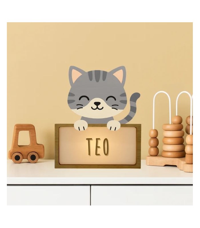 Lámpara quitamiedos con forma de Gato. Como todos nuestros productos, puedes personalizar la lámpara con el nombre que quieras ya que viene con el kit de letras y símbolos.