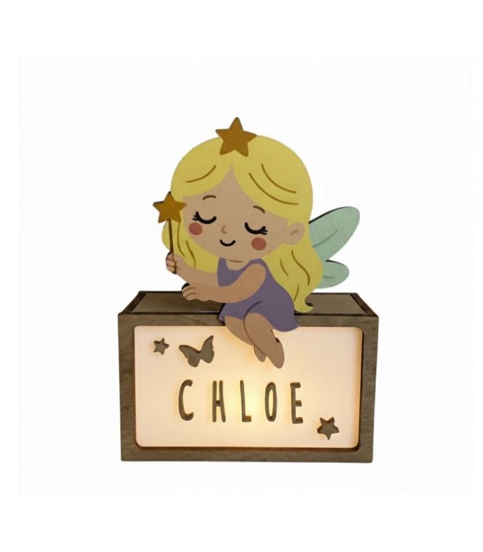 Lámpara quitamiedos con forma de Hada. Como todos nuestros productos, puedes personalizar la lámpara con el nombre que quieras ya que viene con el kit de letras y símbolos.