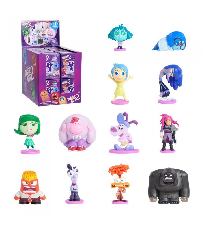 Inside Out 2. Tamaño: 2-6cm. Edad: +3 años. Cada caja ciega contiene 1 de los 12 posibles personajes de la exitosa secuela de Disney y Pixar. Descubre la alegría, la tristeza, la ira, el miedo, el asco, la vergüenza, la ansiedad, la envidia, el hastío, Bloofy, Lance, o el raro secreto oscuro que brilla en la oscuridad. Las figuras están minuciosamente esculpidas con expresiones faciales atrevidas y poses con personalidad que transmiten todas las sensaciones.