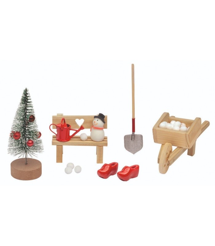 Kit de accesorios para duendes. Cada set incluye adorables accesorios para complementar el mundo de los duendes. Set ?En la casita del duende?: sillón, alfombra, estantería, libros, vela, plantas, taza de café y taburete. Set ?En el jardín del duende?: banco, carretilla, regadera, abeto, zapatos, pala, muñeco de nieve y bolas de nieve. Presentado en una caja de regalo. Sillón: aprox. 8 cm x 7 cm x 7,2 cm cm x 5 cm