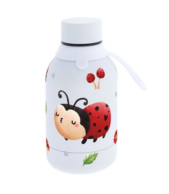 Botella de agua de acero inoxidable 350ml Botella de doble capa de acero inoxidable - Capacidad: 350ml - Resistente durante 24 horas frío y hasta 12 horas calor - Adaptador de goma enganchado a la botella para que puedas cogerla y llevarla con mayor facilidad Medidas: - 7,5 cm diámetro x 15,5cm alto