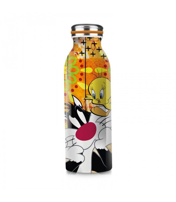 Botella de 500 ml con diseño de Silvestre y Piolín, fabricada en acero inoxidable. Viene en una caja decorativa redonda. No apta para microondas ni lavavajillas
