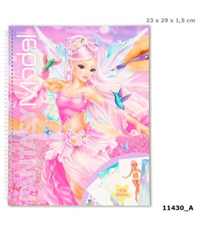 El cuaderno FANTASYModel, encuadernado en gusanillo, lo tiene todo para darle alas a tu fantasía: 78 páginas con figurines para colorear o pegar, 2 hojas de pegatinas y una plantilla para crear muestras. ¡Qué fantásticamente divertido es colorear y pegar!