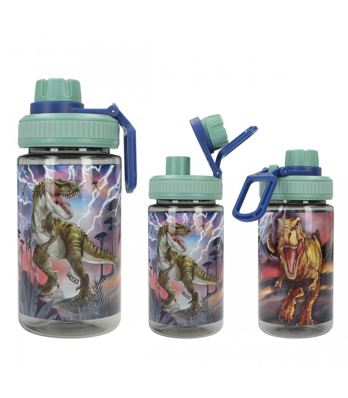 Para calmar la sed tan grande como la de un dinosaurio: Esta botella de Dino World de 500 ml está completamente decorada con escenas de dinosaurios chulísimos, entre los que destaca un impresionante tiranosaurio rex sobre fondo de cielo cubierto de rayos. El tapón de rosca lleva incorporada una práctica asa. Se recomienda lavado a mano para proteger las ilustraciones estampadas. No apta para microondas. Material: plástico neutral a olores e irrompible.