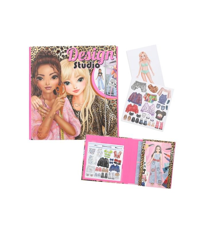 Dibujar y crear como una auténtica diseñadora. El cuaderno de dibujo TOPModel Design Studio consta de 30 páginas con figurines de modelos, 1 plantilla, 10 páginas con 20 estampados de estilos diferentes, 2 hojas de pegatinas y muchos ejemplos fáciles de diseño para poder inspirarse.