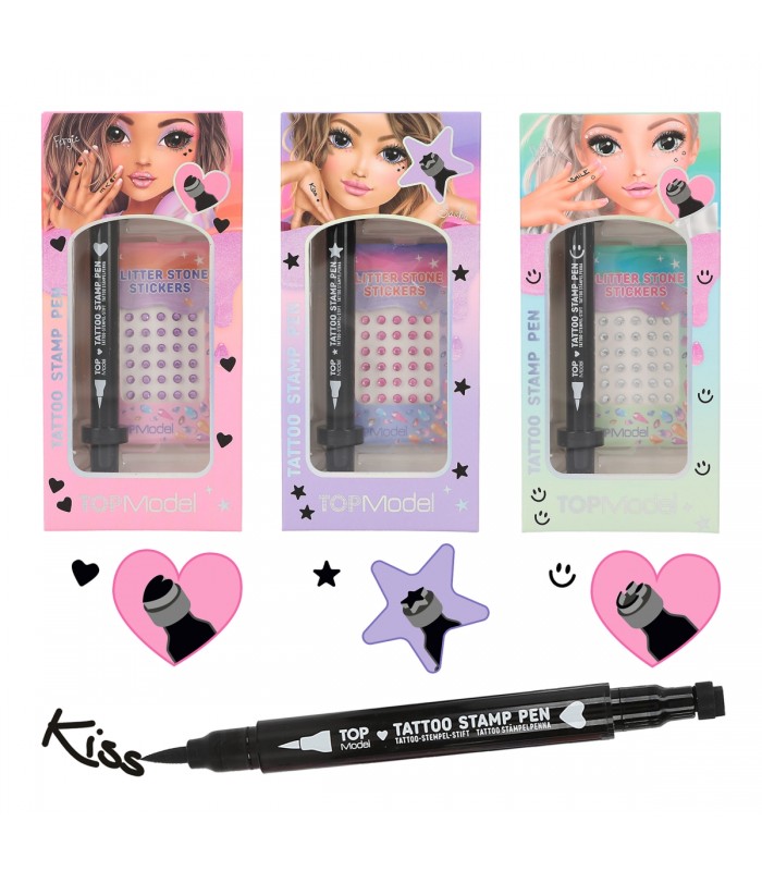 Para pequeñas obras de arte en la piel. Los rotuladores estampadores de tatuajes de TOPModel tienen dos puntas. En una llevan un cuño con un motivo para tatuar y la otra punta está provista con un pincel fino para poner acentos de belleza individuales a los tatuajes. El set también incluye brillantitos adhesivos. Disponibles tres diseños distintos: rotulador negro con tatuaje de estrella y brillantitos rosa; rotulador negro con tatuaje de emoji sonriente y brillantitos blancos; rotulador negro con tatuaje de corazón y brillantitos lila.