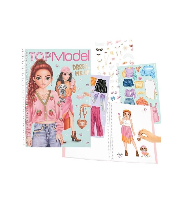 En el libro de pegatinas encuadernado con gusanillo TOPModel Dress me up todo gira en torno a looks chulísimos: 7 hojas de pegatinas (5x pegatinas de papel, 2x pegatinas de vinilo) de ropa a la última y complementos para crear los estilismos de 20 modelos y sus mascotas