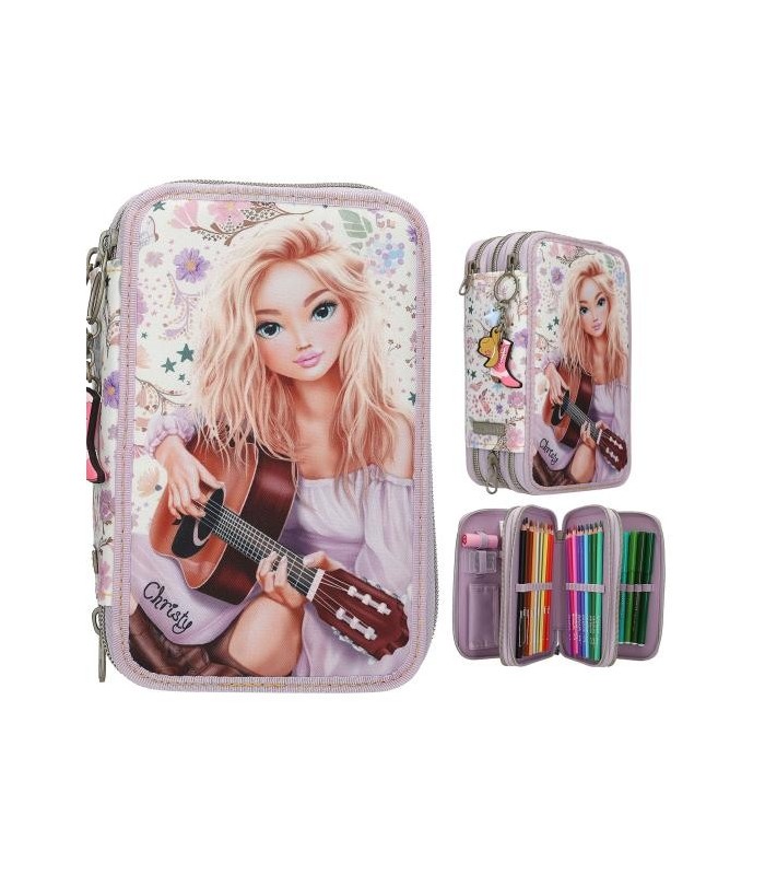 Cowgirl-cool: Este estuche de TOPModel color crema con detalles lila pálido lleva la cara delantera adornada con el romántico motivo de una modelo tocando la guitarra. Todo el tejido está estampado con delicadas florecitas, hojas, estrellas y botas de cowboy. Extra monísimo: Del tirador de la cremallera cuelgan un sombrero de cowboy, una bota de cowboy y una estrella de alegres colores.