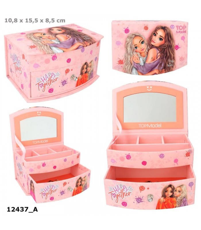 Este pequeño joyero de TOPModel hace feliz a cualquiera con sus colores alegres, smileys con forma de manchurrón y dos maravillosas modelos amigas. El joyero lleva espejo en la cara interior de la tapa abatible, tiene un compartimento principal subdividido y un cajón con un brillante en el tirador.