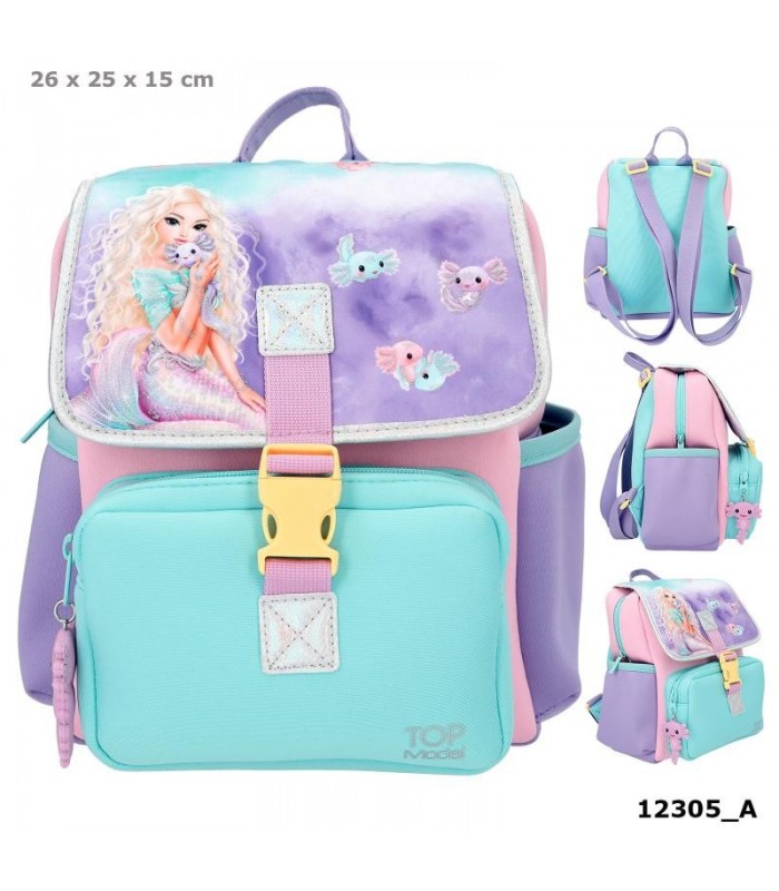Un sueño bajo el mar. Esta mochila pequeña de TOPModel es de neopreno agradable al tacto en luminosos colores turquesa, rosa y lila. Lleva una bellísima sirena adornada con brillantitos y rodeada de simpáticos ajolotes en la solapa. El compartimento principal y el bolsillo delantero cierran con cremallera. También tiene bolsillos laterales y los tirantes son ajustables. Destacan especialmente el cierre de clic en la solapa de color amarillo y el colgante de ajolote. Material: poliéster 100 por 100; recubrimiento: PU 100 por 100.
