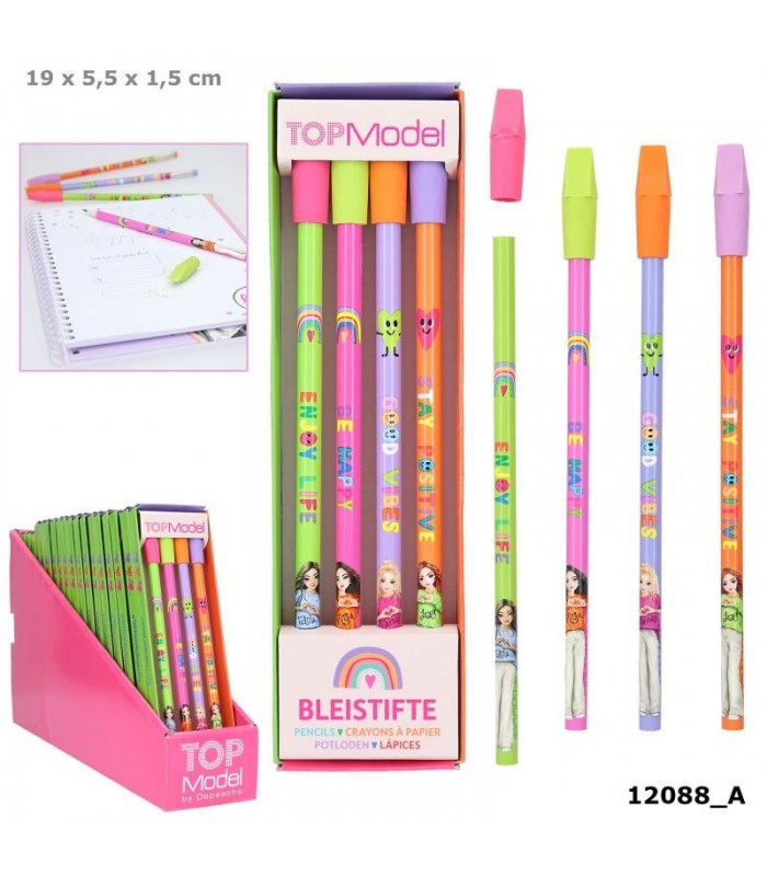 Para escribir con mucho colorido. Los cuatro lápices (HB) de la colección Selflove de TOPModel transmiten buen humor y alegría nada más verlos. Pero también los lemas que llevan impresos contribuyen a esta positividad: Stay Positive, Good Vibes, Be Happy, Enjoy Life. Con gomas de borrar del mismo color como toppers intercambiables. Se venden en embalaje de cartón.