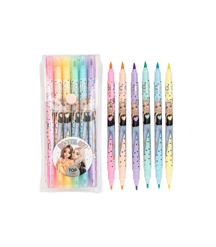 Los colores pastel están de moda! Estos 6 rotuladores de punta doble tienen en un extremo una punta con forma de pincel y en el otro extremo llevan punta de rotulador fino (1 mm). En colores naranja, amarillo, verde, azul, lila y rosa suaves.