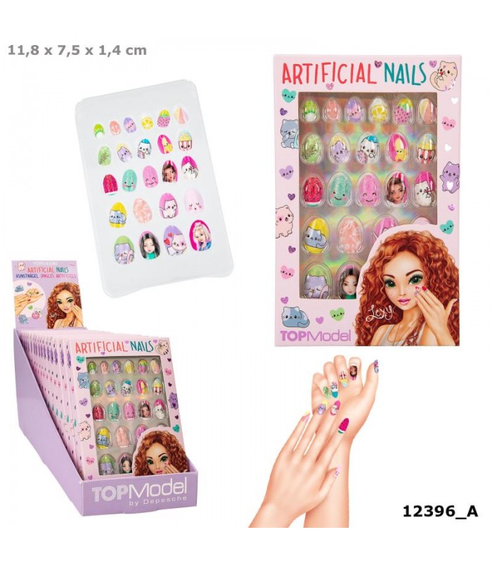 Largo: 1.4 cm Ancho: 7.5 cm Alto: 11.8 cm Peso: 0.02 kg Edad recomendada: 4 Para las auténticas reinas de la belleza. Las 24 uñas postizas autoadhesivas de TOPModel tienen distintos tamaños para adaptarse perfectamente a las uñas verdaderas. Con diseños preciosos e incluso adornadas parcialmente con detalles brillantes. En las instrucciones adjuntas se explica cómo adherirlas y cómo retirarlas. Ingredients: PHENOXYETHANOL, AQUA, ACRYLATES COPOLYMER